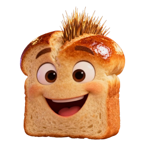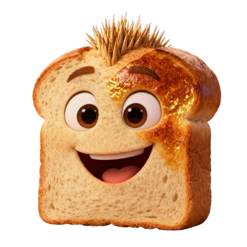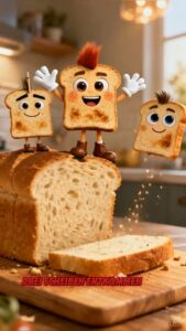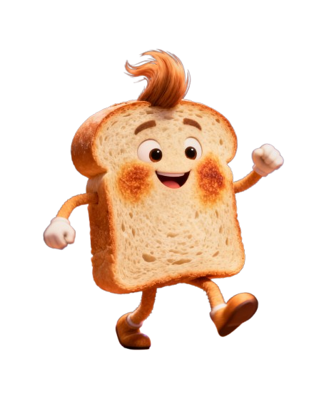 Husch und weg, das Toastbrot liegt auf ein Brotbrett und wird geschnitten. Drei Toastscheiben wollen nicht gegessen werden und eilen davon.